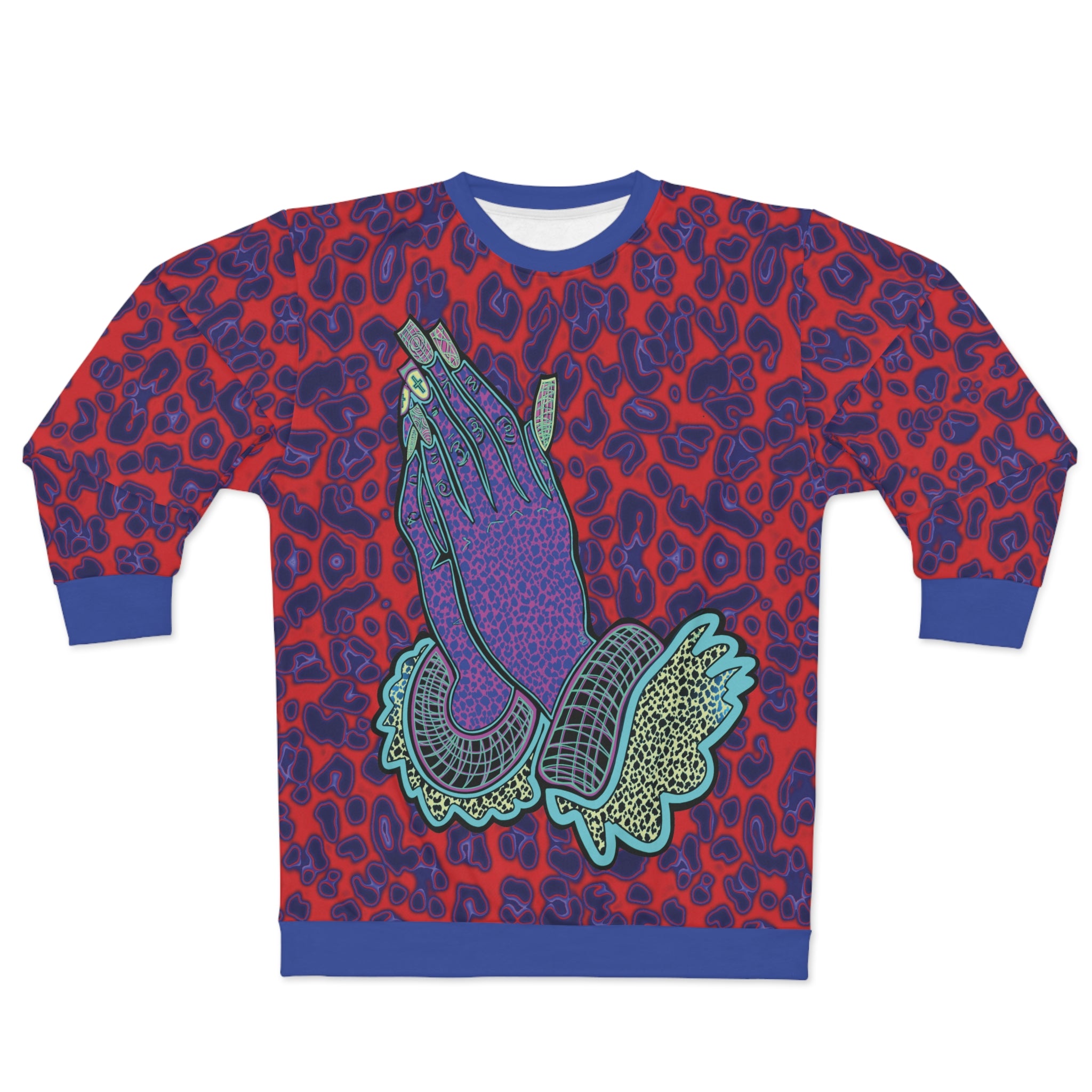​Vibrant, All-Over Print: The hands are set against a background of bold red and deep blue animal-print-inspired patterns, ensuring this piece turns heads wherever you go.