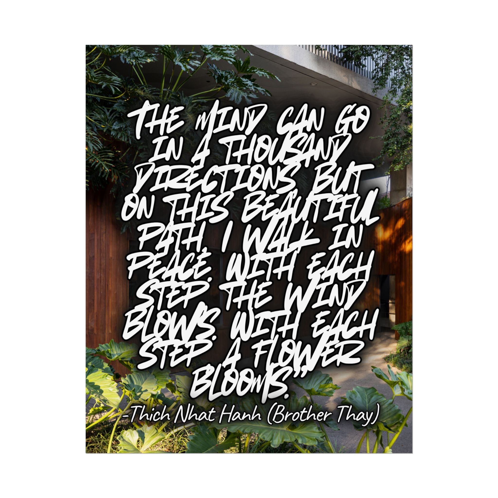 This rolled poster carries a quiet, contemplative energy—handwritten-style words from Thich Nhat Hanh layered over a lush garden scene. The matte, semi-glossy, or fine art paper options let you choose the exact look and texture: go for a soft, textured fine art finish if you want a painterly, archival feel; choose semi-glossy for vivid, punchy color and a satin sheen; or pick matte for a subtle, low-reflective display that keeps attention on the message. Hang it in a reading nook, meditation corner, or by a doorway to invite calm and mindful pauses. The design feels lived-in and personal, as if someone left a gentle note to slow down—simple, warm, and thoughtfully made for adults who appreciate soulful decor and meaningful words.