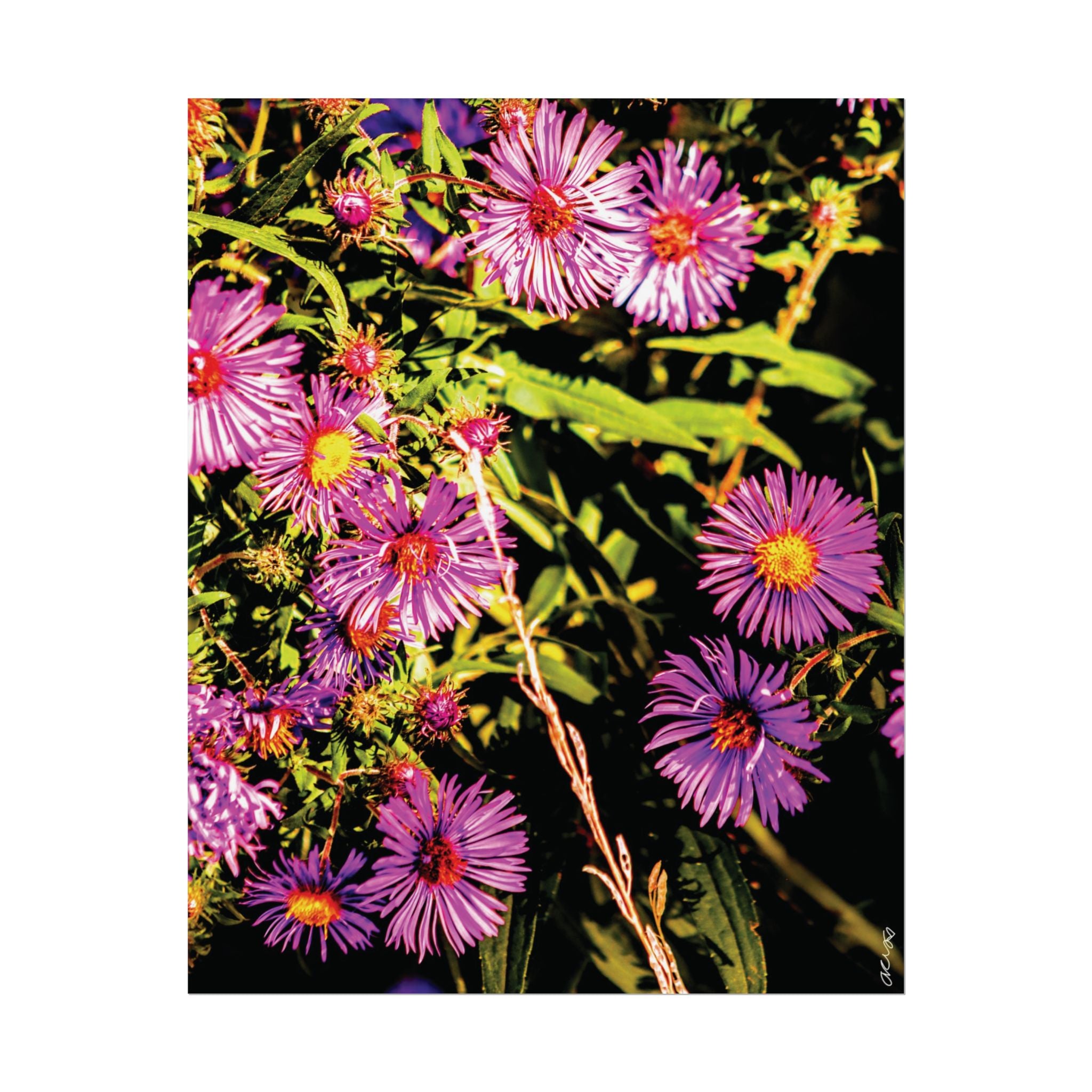 A vibrant floral poster that brings a burst of late-summer garden energy into any room. Deep magenta asters pop against rich green foliage and a moody dark background, creating contrast that reads like a photograph yet feels intimately painterly. Choose from textured fine art, satin semi-gloss, or soft matte finishes to match your space — whether you want luminous, museum-like color or a subdued, artful presence. Hung vertically or laid out horizontally, this print slips easily into reading nooks, studio walls, or gallery-style arrangements and ages beautifully thanks to archival giclée inks.
